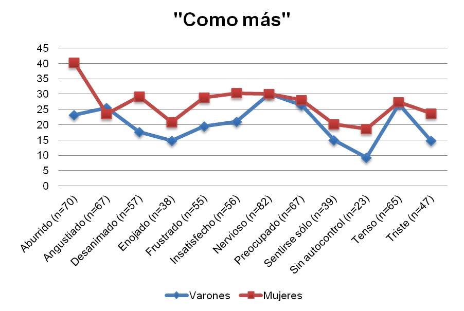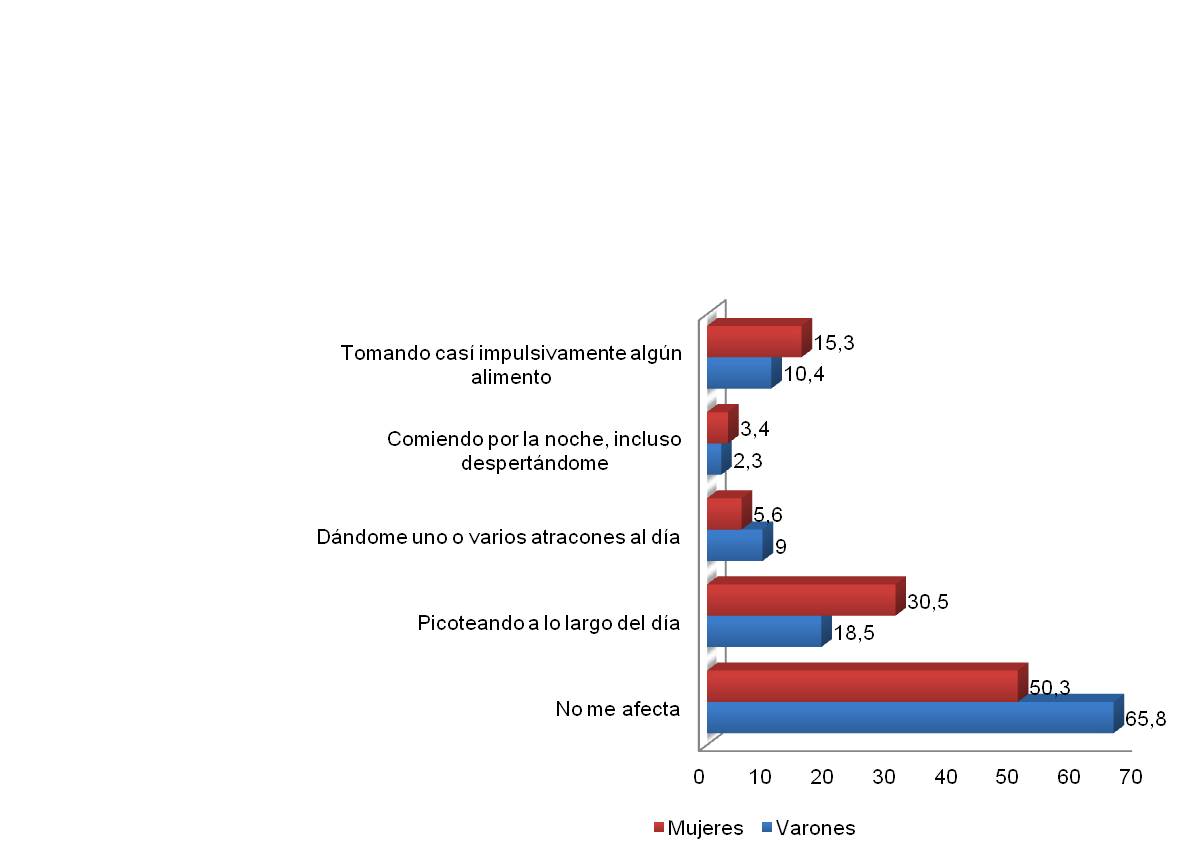 As such, negative emotions felt in stressful situations related to the work environment tend to affect the eating habits of a significant portion of workers, both men and women, in such a way that some tend to eat less and others tend to eat more. Those that “eat their feelings” in regards to experienced uneasiness made up a moderate percentage, with a clear trend toward eating more food for emotions related to anxiety than related to depression, especially for women.