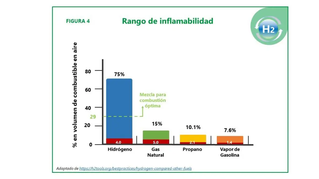 - Additionally, hydrogen has a wide range of concentrations in the air in which ignition can occur (flammability range, between 4% and 75% by volume), much greater than that of other gaseous fuels (Figure 4). However, the concentration of hydrogen from which the mixture is flammable (the lower limit of flammability) is greater than the concentration of propane and gasoline vapors, which is also a point in its favor in terms of safety.