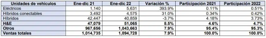 Los últimos datos publicados por la asociación indican que la hoja de ruta marcada por el sector se está cumpliendo con éxito, aunque lentamente. En 2022 se comercializaron 51.065 vehículos con tecnologías electrificadas. En el marco de la industria, la venta de eléctricos e híbridos correspondió al 4,7% del total, lo que supone un crecimiento progresivo, pero no un volumen relevante en el parque automotriz.